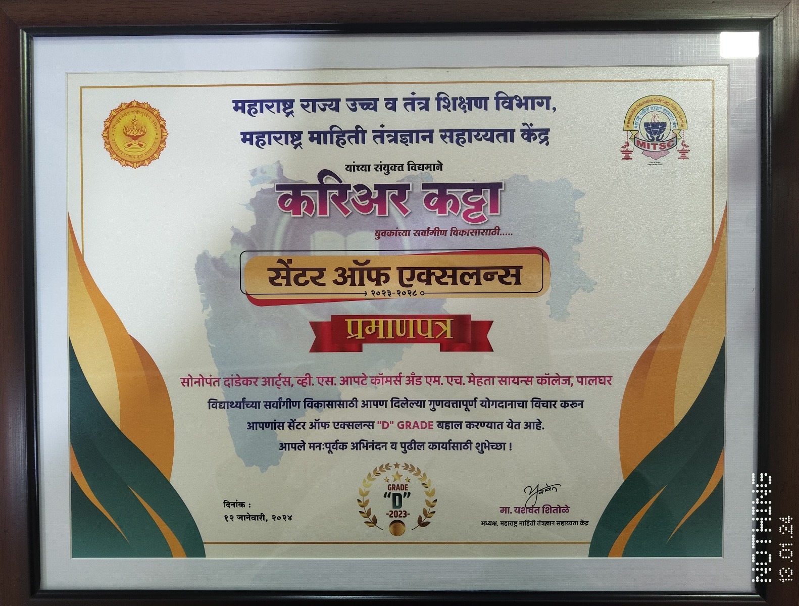 Sonopant Dandekar College, Palghar awarded with Certificate for the establishment of Centre of Excellence for the holistic development of the learners